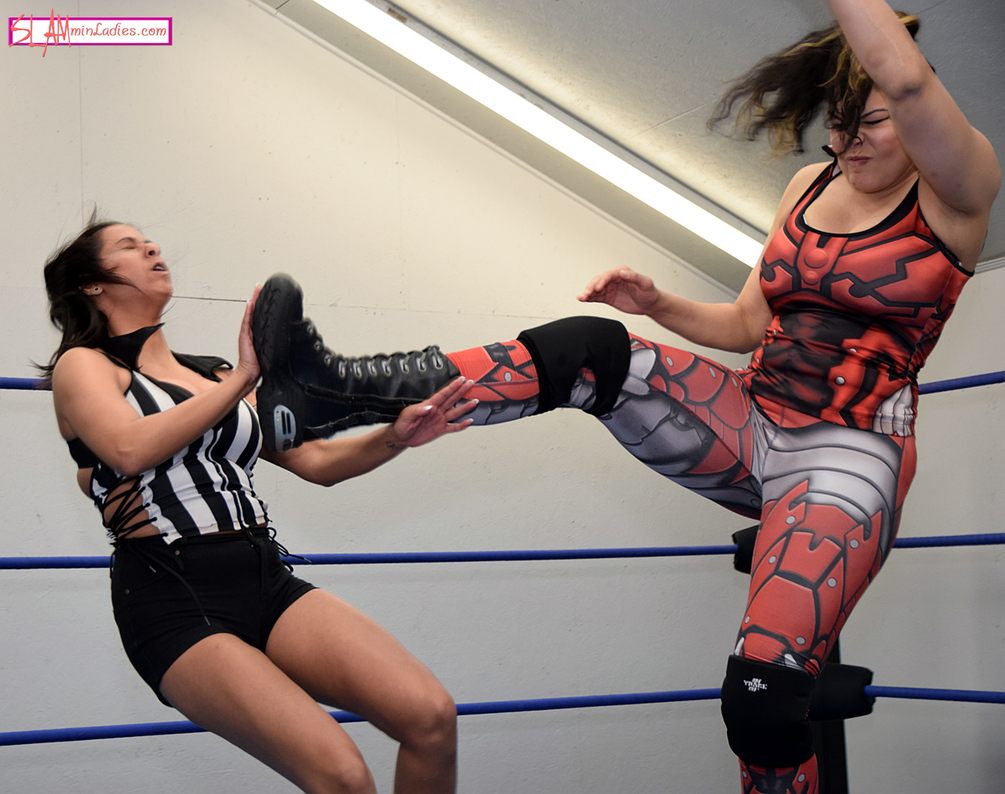 Seeking payback for Amanda’s previous lack of impartiality, Vanessa takes the referee down with a big boot and in less than a minute, Amanda is out for the count. Unfortunately, the absence of a referee (a conscious one, at least!) means there is nobody to tell Vanessa that the match is over.