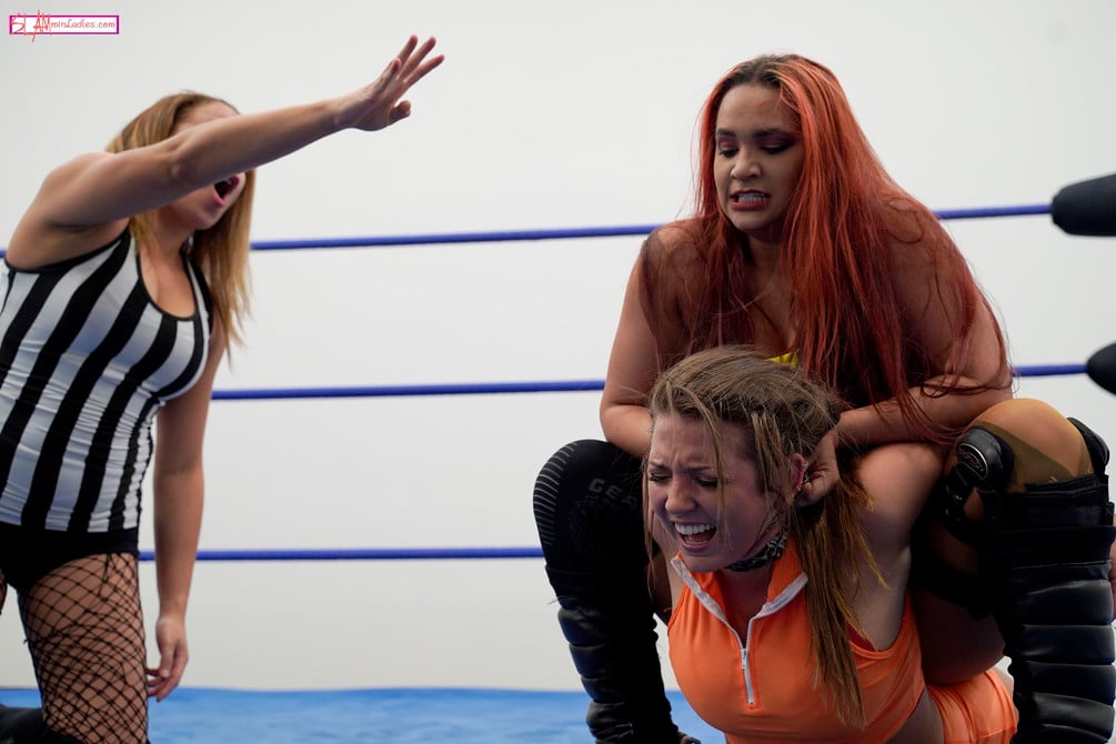 Only it isn’t over as Didi reapplies the hold refusing Rocky’s order to break it. Didi’s had enough of Rocky and the 2 come to blows as Madi collapses to the floor. Didi seems to have the upper hand in the wild melee until a very interested pink bystander intervenes determined to help Rocky teach Didi a prolonged and painful lesson in respecting referees!