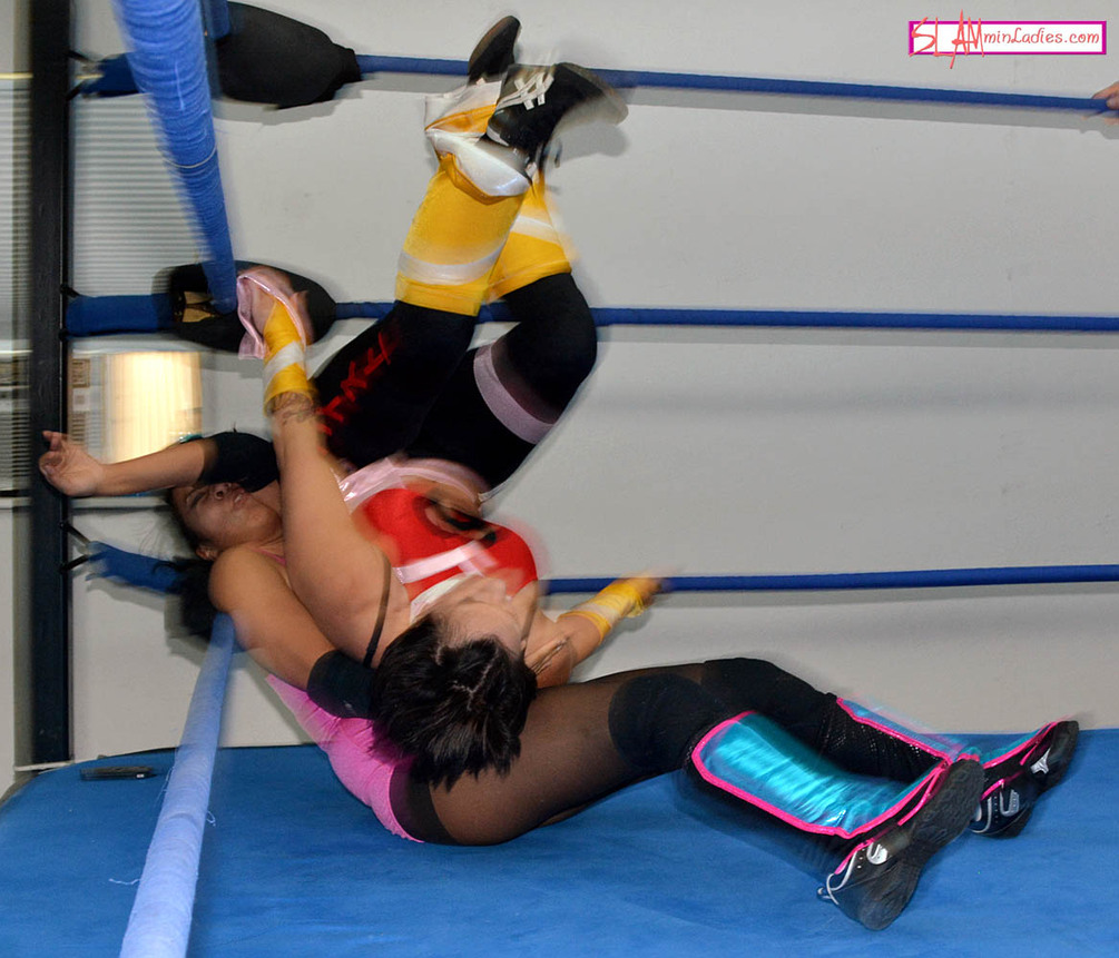From this point on, things get a little more desperate–kicks to the head, cannonballs to the corner, vicious throat punches. It could go either way right until one lady’s spectacular finisher has one wrestler practically out for the count.