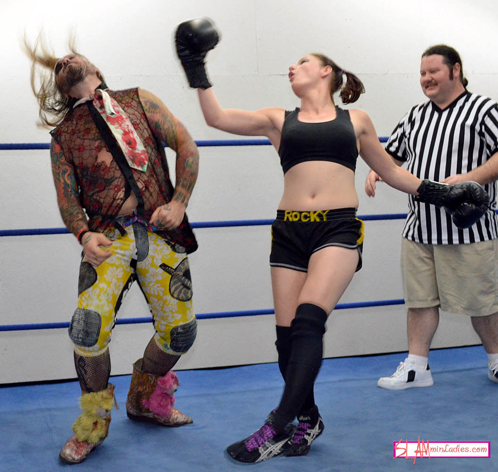 This is a unique match-up pitting Sinn against Leva Balboa! With her hands well protected, Leva is free to tee off on her grotesque opponent, which she does with power and precision. Sinn is knocked silly by Leva's pugilistic powers and her potent punches lead to some precarious pinfalls. She slams his head into all four corners and then levels him with a right hook. Sinn might be used to getting tattooed, but not like this!