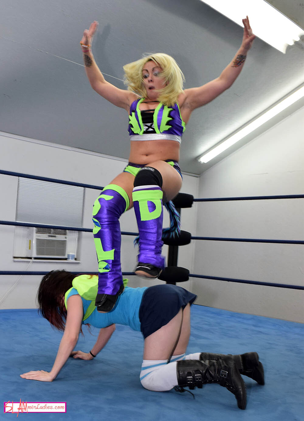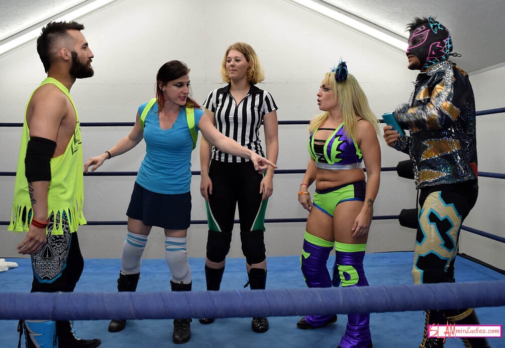 It all starts with Rhia O’Reilly officiating a fierce Pokemon battle between Cruz and Lince Dorado. The defeated Cruz declares that his girlfriend can beat Lince’s. Enter Cruz’s lady, Leva (dressed as Finn from Adventure Time), and Lince’s squeeze, Solo Darling (sporting her trademarked cat ears and tail). What ensues is a wild intergender tag team match that sees the men dazzle with their speed and quickness, the ladies impress with their ring smarts and technical abilities, and the occasional female grappler taking a male counterpart down a notch or two.