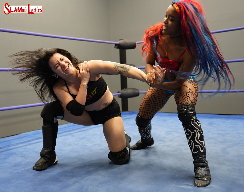 Kiera goes for the pin but only gets a 2 count with Diamante gasping, "Not like that. Not today!" Kiera is furious about Diamante's refusal to stay down and stands on her throat in a display of heelish dominance but Diamante brings her to the ground and applies a Headlock but Kiera pulls the hair to escape. Kiera then kicks Diamante around the ring and goes for another pin but Diamante kicks out once again. Now Kiera is getting frustrated and she brings Diamante to her feet and applies a guillotine headlock but Diamante reverses it into a Russian Leg Sweep. Will Diamante's toughness win the day or will Kiera's dirty tactics score the victory? The bout could go either way!