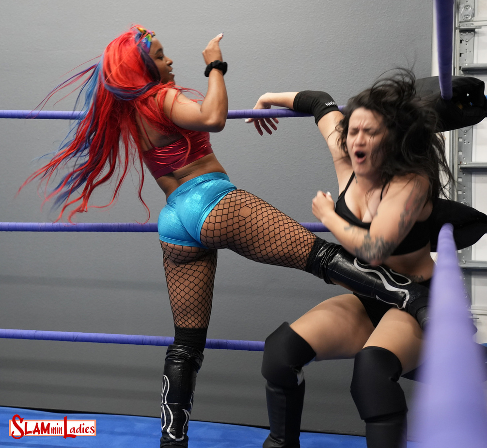 Diamante seems eager to challenge the bright haired Kiera and she quickly Snapmares her to the mat and gets her in a Sleeperhold but Kiera expertly counters into a Wristlock. Diamante gets excited by this display of skill and counters into her own Wristlock followed by another Sleeperhold. Kiera elbows her way out of it and sends Diamante into the turnbuckle where she uses her foot to choke the spunky spirit out of her opponent.