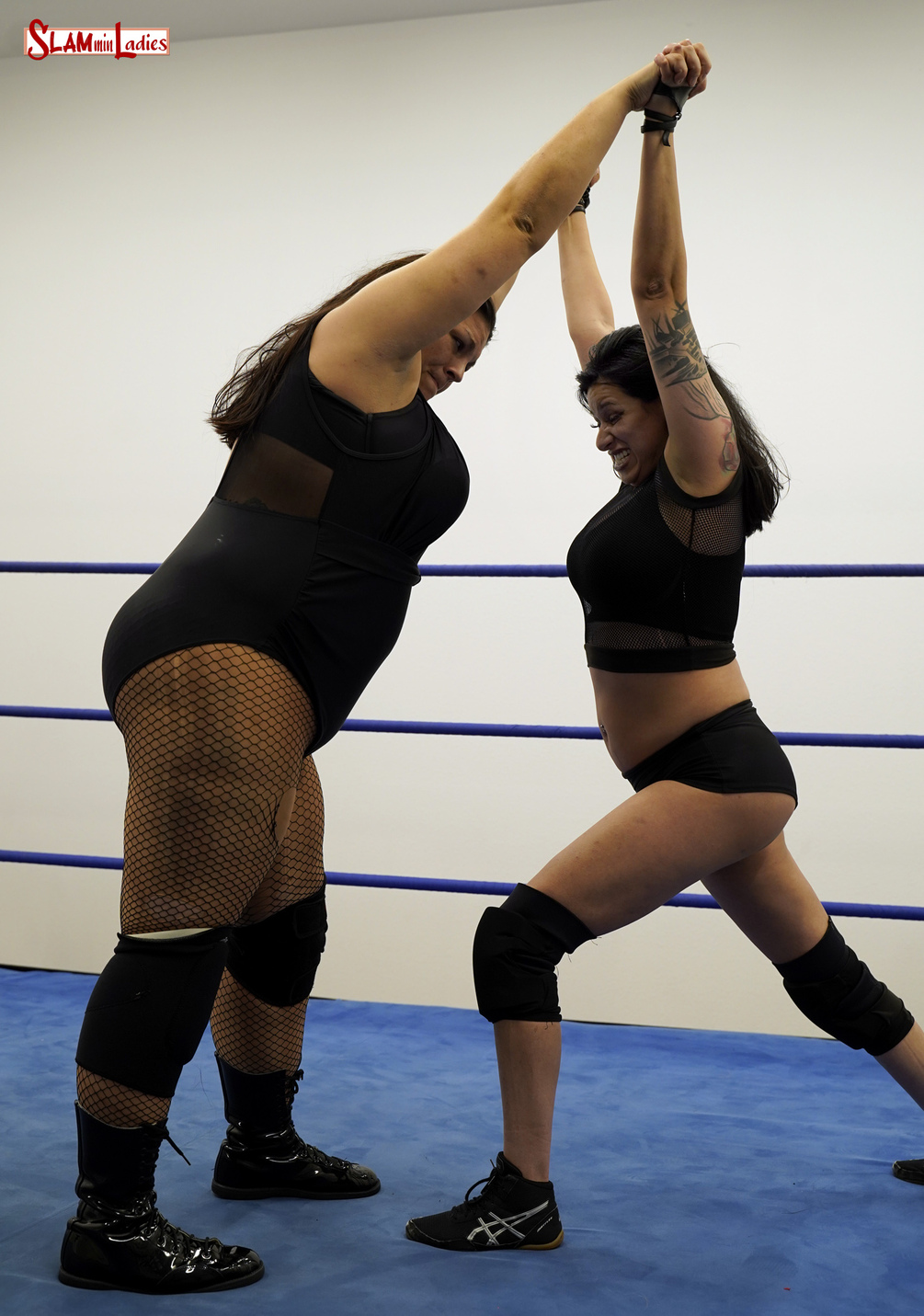 Miss Rachel opens the second fall with a double Wristlock. Demanding “What’s my name again?”, Amanda plays with fire by answering “Raquel? Robin? Ruth?” Each incorrect answer is met with a vicious slap across the chest. A running splash in the corner gets Rachel a 6 count, then she drags Amanda to the corner and lands a sitdown splash from the second rope to earn an easy 10 count.